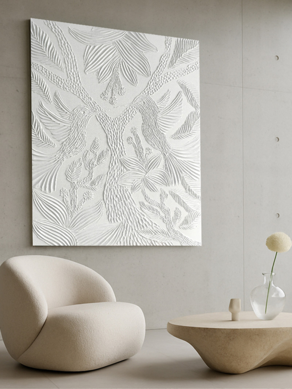 Jemný minimalistický strukturální obraz v bílé barvě, který nádherně rozzáří nejen bílou stěnu, ale i celý prostor. Díky plastické struktuře obrazu se během celého dne vytváří fascinující hra světel a stínů, která obrazu dodává živost a dynamiku. Lehký lesk povrchu způsobuje, že obraz vždy září, vytváří tak výrazný, přesto jemný a harmonický prvek, který se přirozeně včlení do každého interiéru.