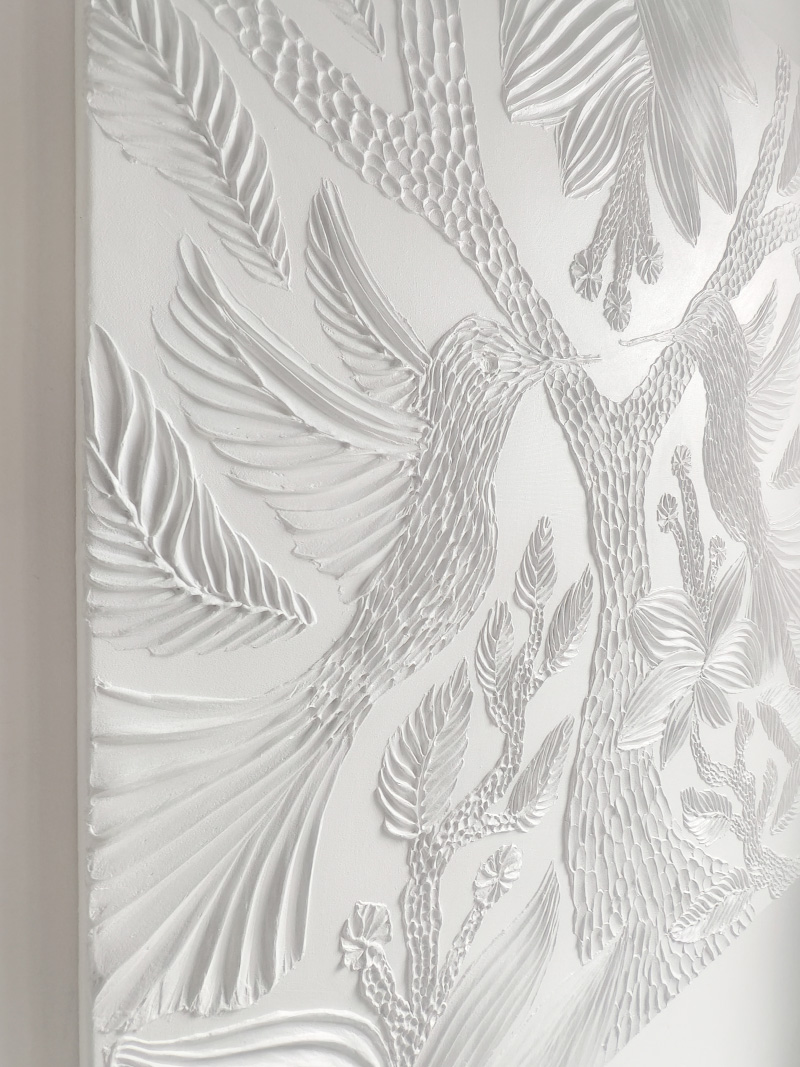 Motiv kolibříků v letu je symbolem nekonečné lásky a krásy. Kolibříci, považováni za posly lásky, jsou známi pro své velké srdce v poměru k malému tělíčku, což symbolizuje čistotu a intenzitu jejich lásky. Jejich rychlý pohyb křídel, které opisují tvar ležaté osmičky, odkazuje na symbol nekonečna, což dodává obrazu hloubku a filozofický nádech. Tento obraz je oslavou lásky, pohybu a nekonečných možností, které jsou vždy v pohybu a v nekonečném propojení.