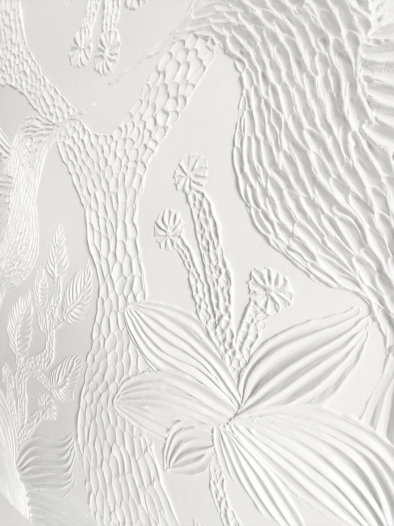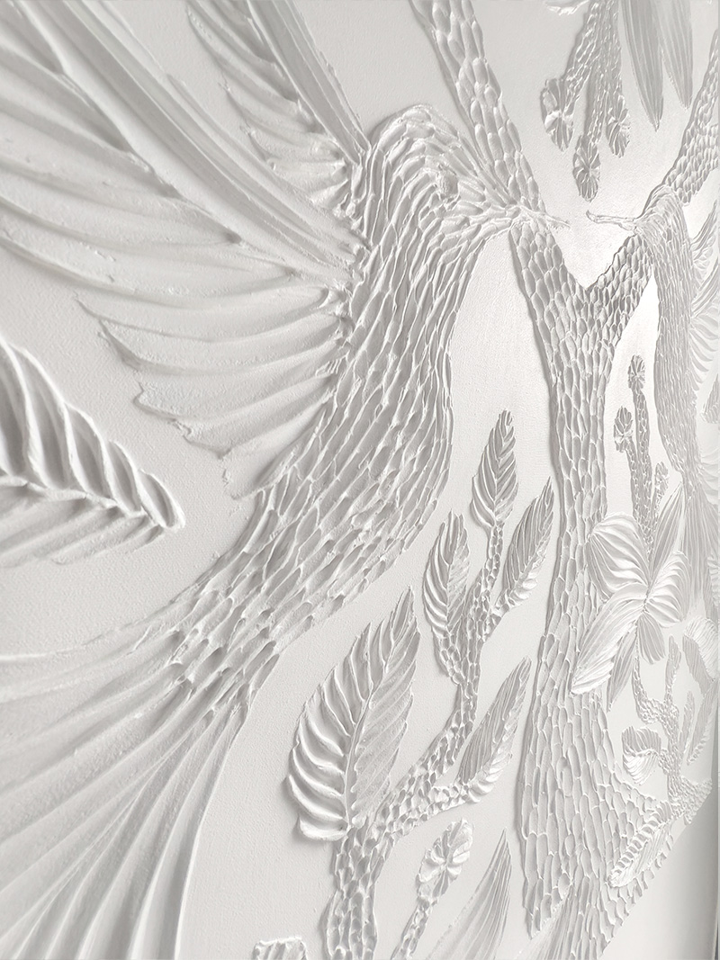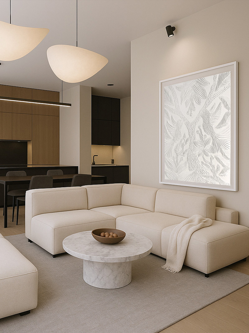 Jemný minimalistický strukturální obraz v bílé barvě, který nádherně rozzáří nejen bílou stěnu, ale i celý prostor. Díky plastické struktuře obrazu se během celého dne vytváří fascinující hra světel a stínů, která obrazu dodává živost a dynamiku. Lehký lesk povrchu způsobuje, že obraz vždy září, vytváří tak výrazný, přesto jemný a harmonický prvek, který se přirozeně včlení do každého interiéru.