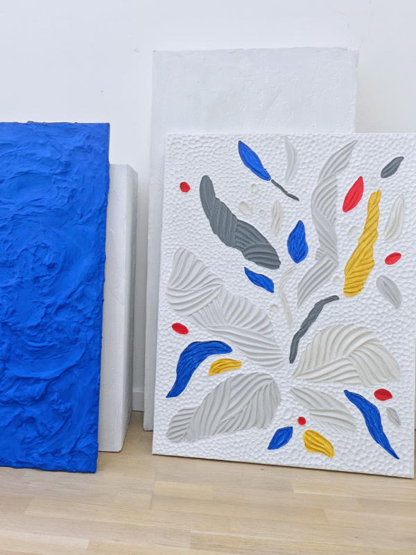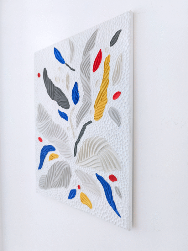 Tento strukturální obraz propojuje čistotu bílé plochy s energií výrazných barevných akcentů. Reliéfní textura na pozadí vytváří jemnou hru světla a stínu, zatímco plastické tvary v odstínech modré, červené, žluté a šedé působí jako pohybující se fragmenty – stopy pohybu, myšlenek nebo emocí zachycených v jediném okamžiku.