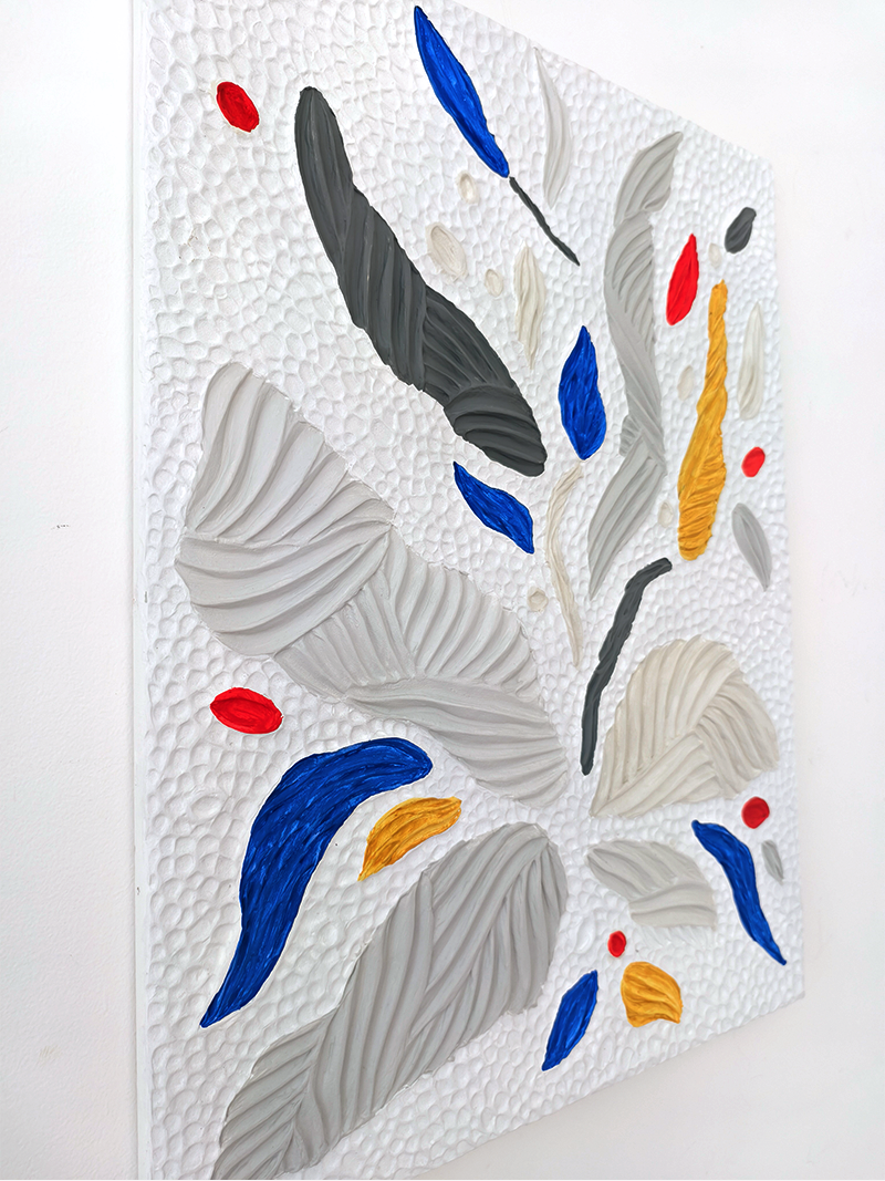 Tento strukturální obraz propojuje čistotu bílé plochy s energií výrazných barevných akcentů. Reliéfní textura na pozadí vytváří jemnou hru světla a stínu, zatímco plastické tvary v odstínech modré, červené, žluté a šedé působí jako pohybující se fragmenty – stopy pohybu, myšlenek nebo emocí zachycených v jediném okamžiku.