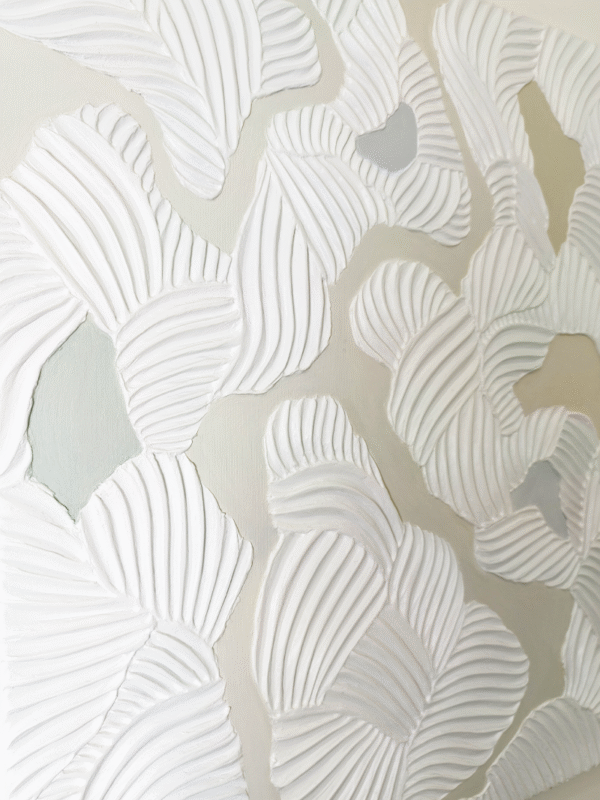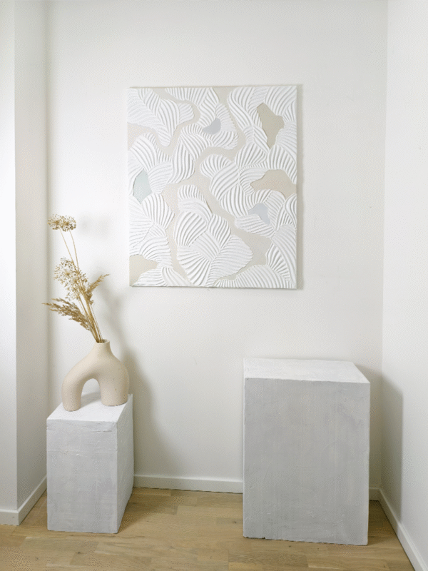 Obraz Zen Fragments je vizuální metaforou harmonie a plynutí přírody. Strukturální reliéf v bílých a jemně tónovaných plochách připomíná fragmenty listů, vln či kamenů, které se stávají součástí celku. Každý detail vypráví svůj příběh, ale až dohromady vytvářejí celek – podobně jako okamžiky, které skládají náš život.