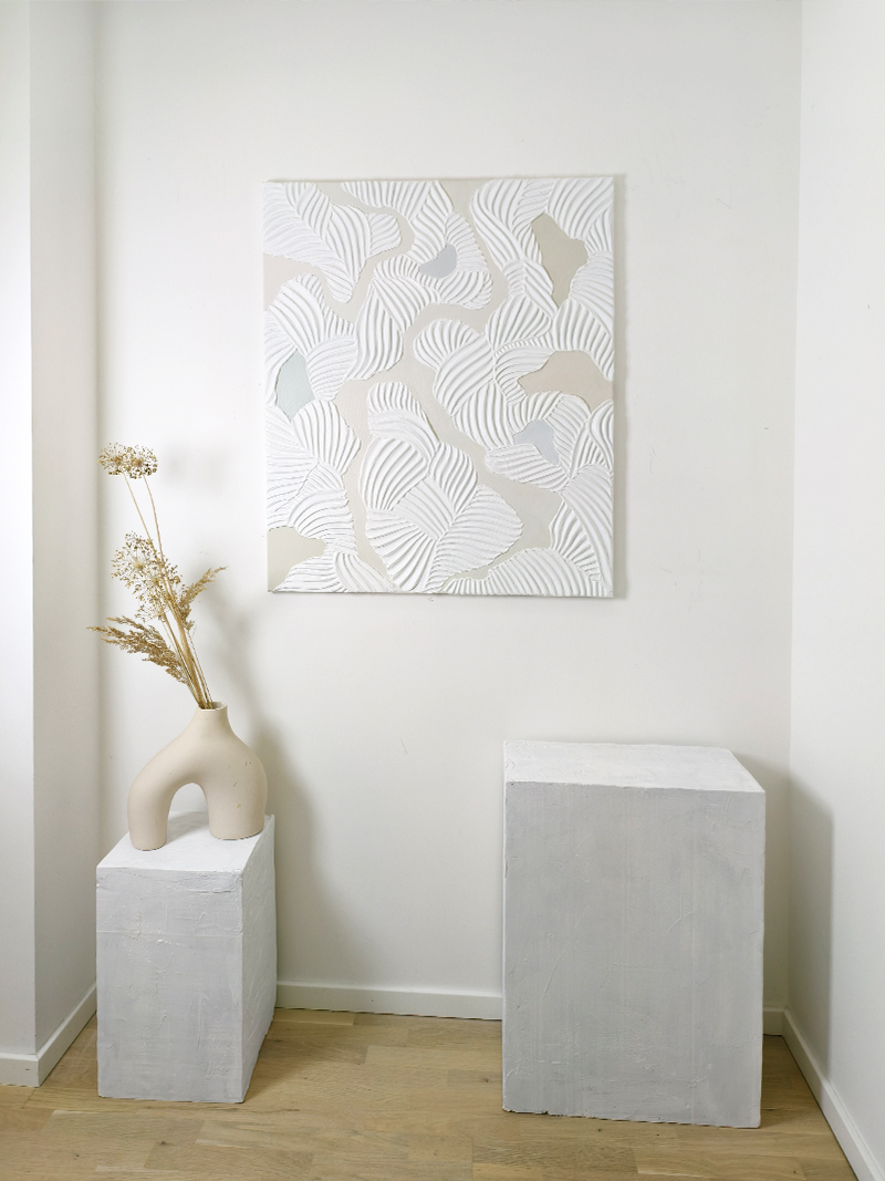 Obraz Zen Fragments je vizuální metaforou harmonie a plynutí přírody. Strukturální reliéf v bílých a jemně tónovaných plochách připomíná fragmenty listů, vln či kamenů, které se stávají součástí celku. Každý detail vypráví svůj příběh, ale až dohromady vytvářejí celek – podobně jako okamžiky, které skládají náš život.